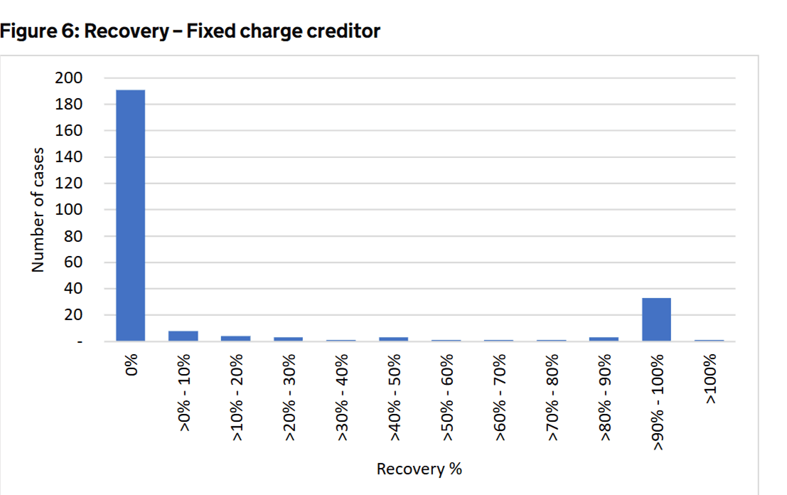 The overall returns to creditors are very poor. The charts below shows preferential creditors that in most cases will be employees and HMRC (post 2020) and Fixed charge creditors who are in fact the first in line showing virtually nil return