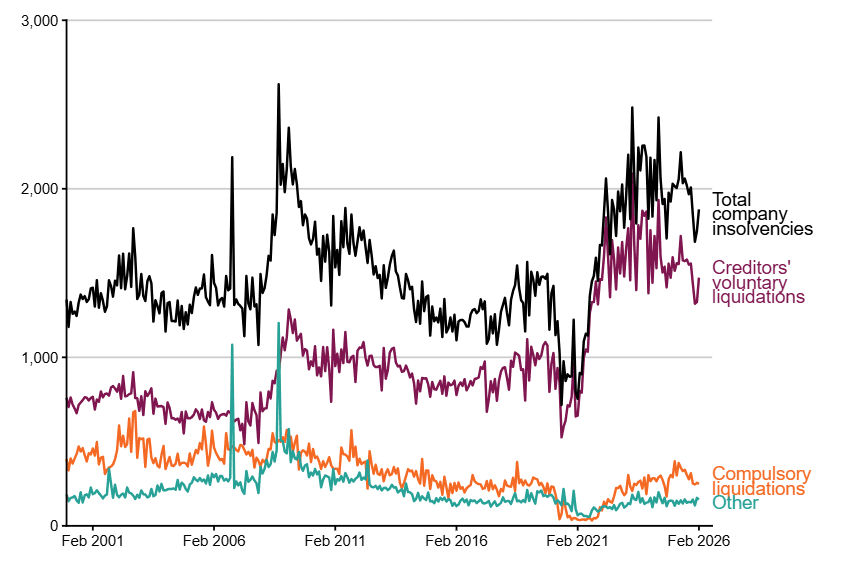 The average monthly number of insolvencies over the last four months was 1,789, which is around 10% lower than the average seen between early 2022 and the end of 2025 (1,982).