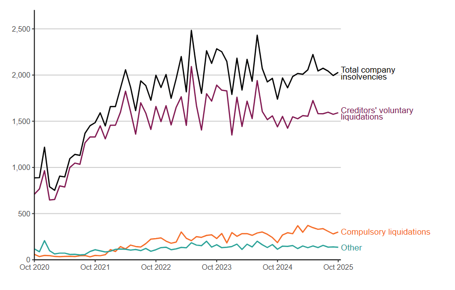 In October 2025, the number of registered company insolvencies in England and Wales was similar to September 2025 levels but 17% higher than in October 2024. The monthly numbers in the first ten months of 2025 have been slightly higher than in 2024, which followed a 30-year annual high in 2023.