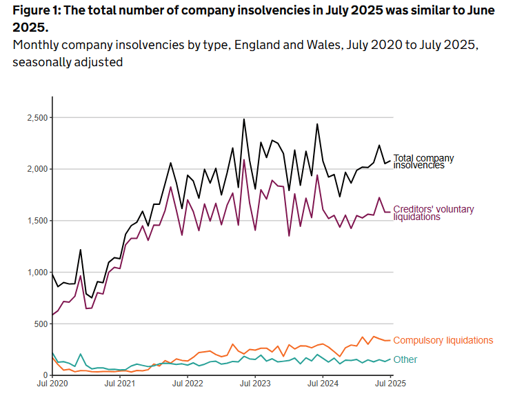 The number of registered company insolvencies in England and Wales was 2,081 in July 2025, similar to both June 2025 (2,053) and the same month in the previous year (2,078 in July 2024). Monthly company insolvency numbers in the first seven months of 2025 were higher than the second half of 2024, but remained slightly lower than the 30-year annual high seen in 2023.