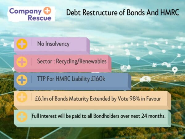 KSA negotiated with bondholders of our client, a recycling business, to ensure £6.1m of bonds had their maturity dates extended by 12 months. A meeting was held and 98% voted in favour of the proposal. We also negotiated with HMRC to allow tax liabilities to be paid off over time. This allowed our client breathing space to be able to raise funds for their further expansion. All this was done without using any costly formal insolvency like a CVA, Scheme of Arrangement or Administration